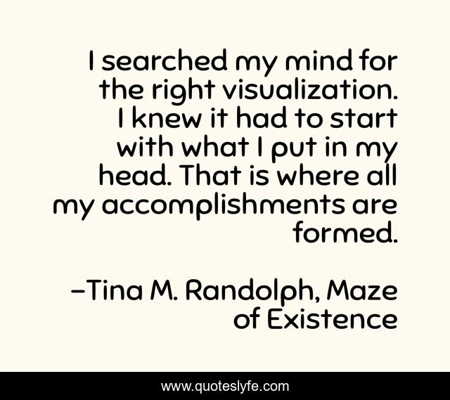 This page presents the quote "I searched my mind for the right visualization. I knew it had to start with what I put in my head. That is where all my accomplishments are formed.". Author of this quote is Tina M. Randolph, Maze of Existence. This quote is about fantasy, inspirational, science-fiction, enthusiasm,.