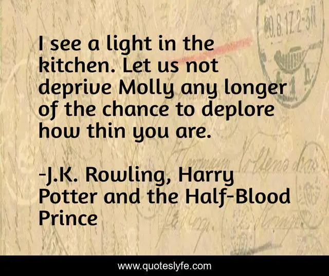 "J.K. Rowling, Harry Potter and the Half-Blood Prince Quotes." Quoteslyfe.com, 2025. Mon. 08 Dec. 2025. <https://www.quoteslyfe.com/quote/I-see-a-light-in-the-kitchen-6232>.
