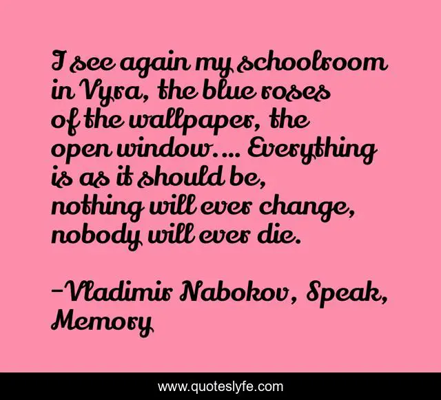 This page presents the quote "I see again my schoolroom in Vyra, the blue roses of the wallpaper, the open window.… Everything is as it should be, nothing will ever change, nobody will ever die.". Author of this quote is Vladimir Nabokov, Speak, Memory. This quote is about beauty, memory,.