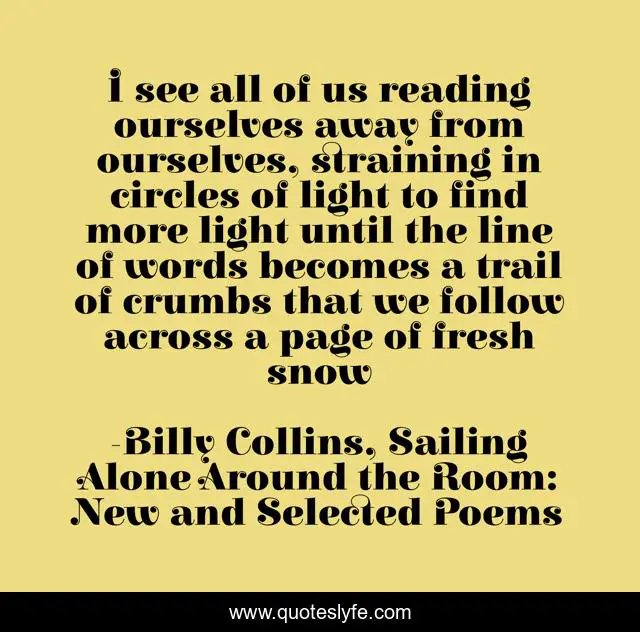 This page presents the quote "I see all of us reading ourselves away from ourselves, straining in circles of light to find more light until the line of words becomes a trail of crumbs that we follow across a page of fresh snow". Author of this quote is Billy Collins, Sailing Alone Around the Room: New and Selected Poems. This quote is about books, literature, poetry, words, reading,.