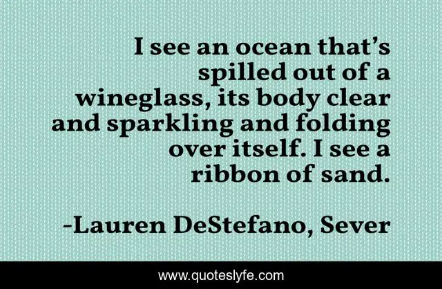 This page presents the quote "I see an ocean that’s spilled out of a wineglass, its body clear and sparkling and folding over itself. I see a ribbon of sand.". Author of this quote is Lauren DeStefano, Sever. This quote is about poetic-fiction, ocean,.