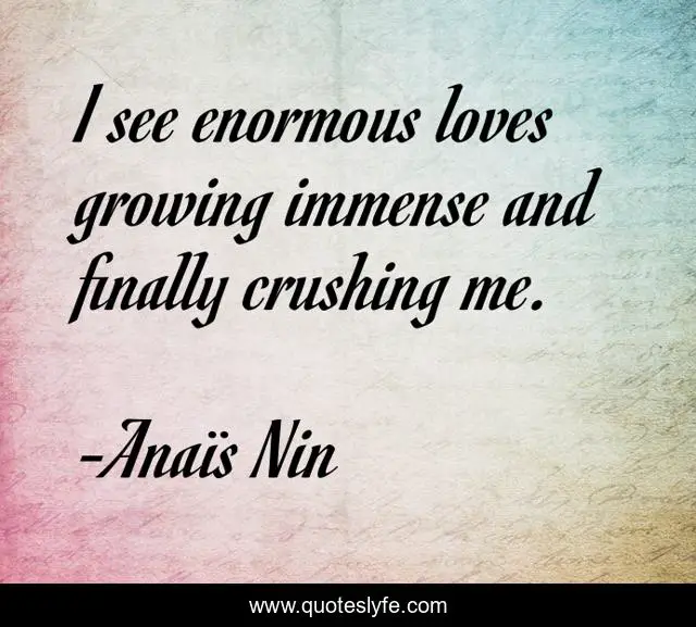 This page presents the quote "I see enormous loves growing immense and finally crushing me.". Author of this quote is Anaïs Nin. This quote is about love, sacrifice, pain, affection,.