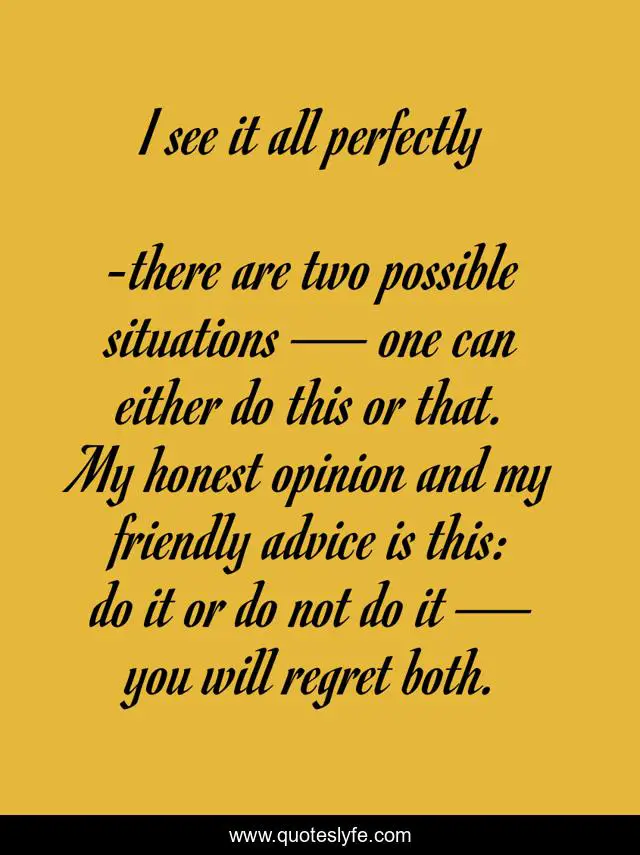 "there are two possible situations — one can either do this or that. My honest opinion and my friendly advice is this: do it or do not do it — you will regret both. Quotes." Quoteslyfe.com, 2025. Fri. 05 Dec. 2025. <https://www.quoteslyfe.com/quote/I-see-it-all-perfectly-2225>.