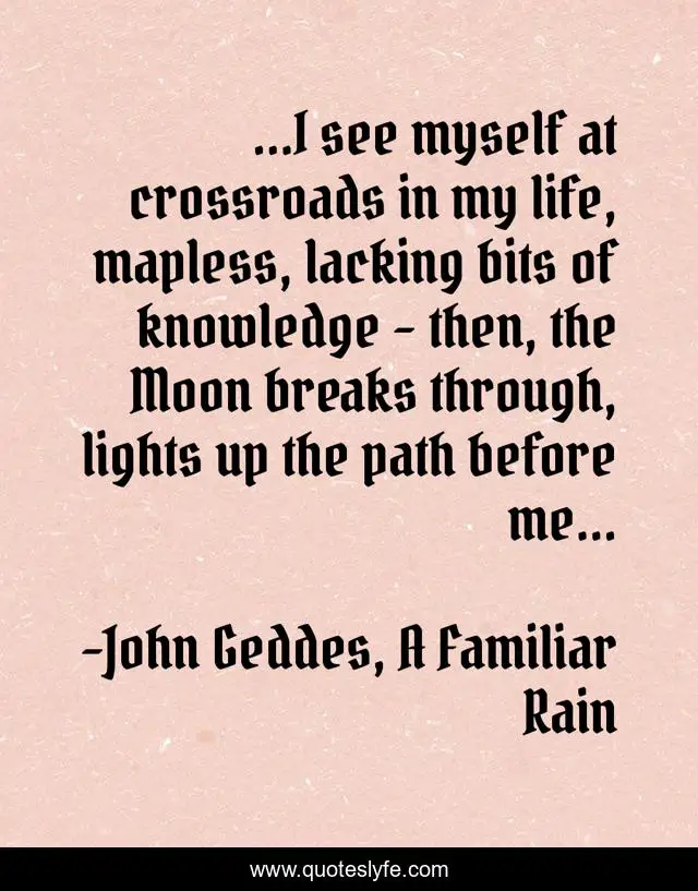 This page presents the quote "...I see myself at crossroads in my life, mapless, lacking bits of knowledge - then, the Moon breaks through, lights up the path before me...". Author of this quote is John Geddes, A Familiar Rain. This quote is about life, knowledge, revelation, moon, mapless-life, lights, path, crossroads, reflection,.