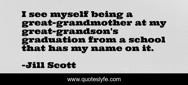 This page presents the quote "I see myself being a great-grandmother at my great-grandson's graduation from a school that has my name on it.". Author of this quote is Jill Scott. This quote is about myself, school, name,.
