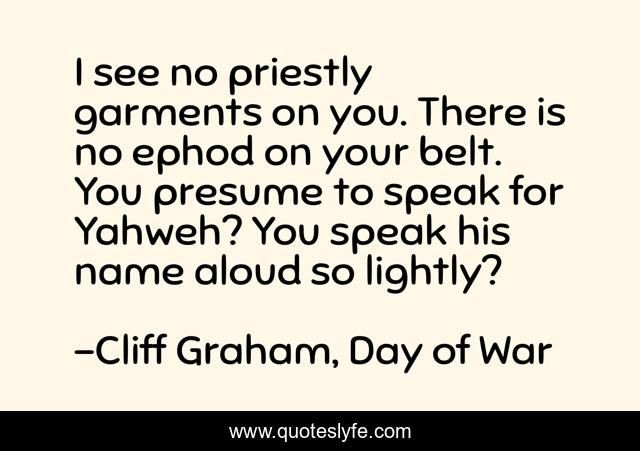 This page presents the quote "I see no priestly garments on you. There is no ephod on your belt. You presume to speak for Yahweh? You speak his name aloud so lightly?". Author of this quote is Cliff Graham, Day of War. This quote is about social-challenge, spiritual-standing, inspiration,.