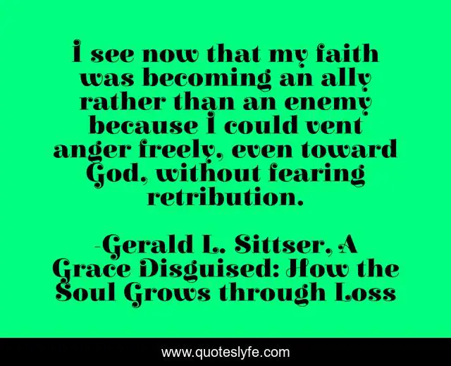 This page presents the quote "I see now that my faith was becoming an ally rather than an enemy because I could vent anger freely, even toward God, without fearing retribution.". Author of this quote is Gerald L. Sittser, A Grace Disguised: How the Soul Grows through Loss. This quote is about grief, faith, loss,.