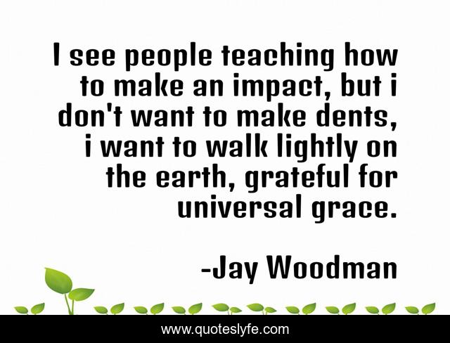 This page presents the quote "I see people teaching how to make an impact, but i don't want to make dents, i want to walk lightly on the earth, grateful for universal grace.". Author of this quote is Jay Woodman. This quote is about impact, lightly, universal, walk, gratefulness, grace,.