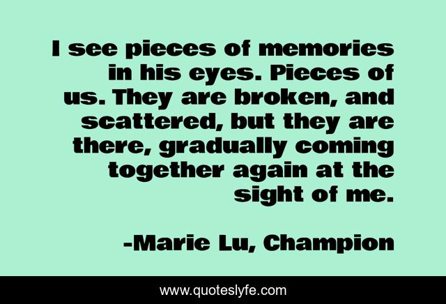 This page presents the quote "I see pieces of memories in his eyes. Pieces of us. They are broken, and scattered, but they are there, gradually coming together again at the sight of me.". Author of this quote is Marie Lu, Champion. This quote is about memories, love, affection,.