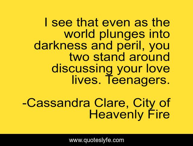 This page presents the quote "I see that even as the world plunges into darkness and peril, you two stand around discussing your love lives. Teenagers.". Author of this quote is Cassandra Clare, City of Heavenly Fire. This quote is about relationships, funny, magnus-bane, shadowhunters, teenagers, comedy,.