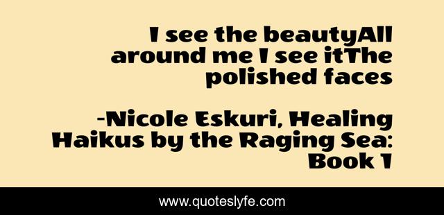 This page presents the quote "I see the beautyAll around me I see itThe polished faces". Author of this quote is Nicole Eskuri, Healing Haikus by the Raging Sea: Book 1. This quote is about enthusiasm, christian, healing, inspirational, haiku,.