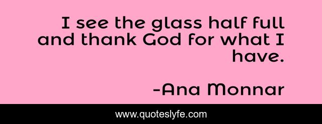 This page presents the quote "I see the glass half full and thank God for what I have.". Author of this quote is Ana Monnar. This quote is about gratitude, god, optimistic, optimism,.