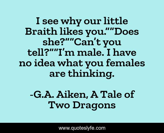 This page presents the quote "I see why our little Braith likes you.”“Does she?”“Can’t you tell?”“I’m male. I have no idea what you females are thinking.". Author of this quote is G.A. Aiken, A Tale of Two Dragons. This quote is about humor, men, love, affection,.