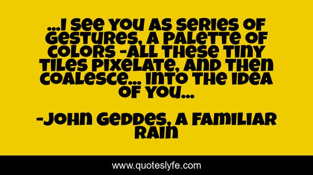 This page presents the quote "...I see you as series of gestures, a palette of colors -all these tiny tiles pixelate, and then coalesce... into the idea of you...". Author of this quote is John Geddes, A Familiar Rain. This quote is about gestures, love, poetry, affection, thoughts-of-you,.