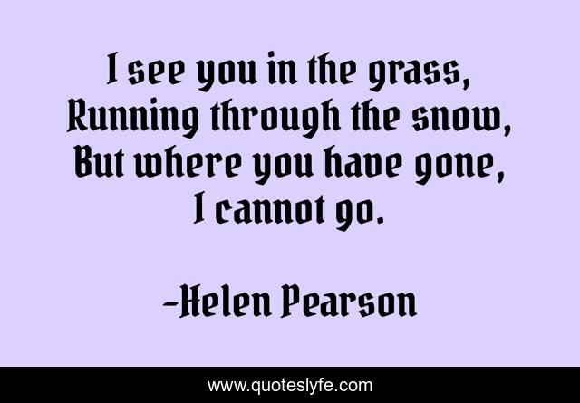 This page presents the quote "I see you in the grass, Running through the snow, But where you have gone, I cannot go.". Author of this quote is Helen Pearson. This quote is about grief, loss,.