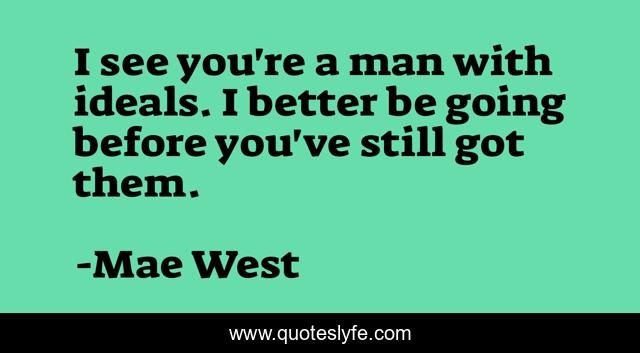 This page presents the quote "I see you're a man with ideals. I better be going before you've still got them.". Author of this quote is Mae West. .