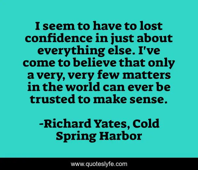 This page presents the quote "I seem to have to lost confidence in just about everything else. I've come to believe that only a very, very few matters in the world can ever be trusted to make sense.". Author of this quote is Richard Yates, Cold Spring Harbor. This quote is about confidence, making-sense-of-the-world,.