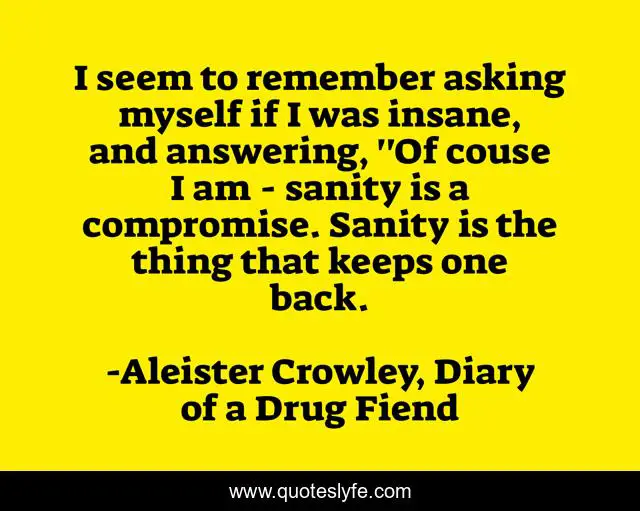 This page presents the quote "I seem to remember asking myself if I was insane, and answering, ''Of couse I am - sanity is a compromise. Sanity is the thing that keeps one back.". Author of this quote is Aleister Crowley, Diary of a Drug Fiend. This quote is about sanity, freedom, compromise, insanity,.