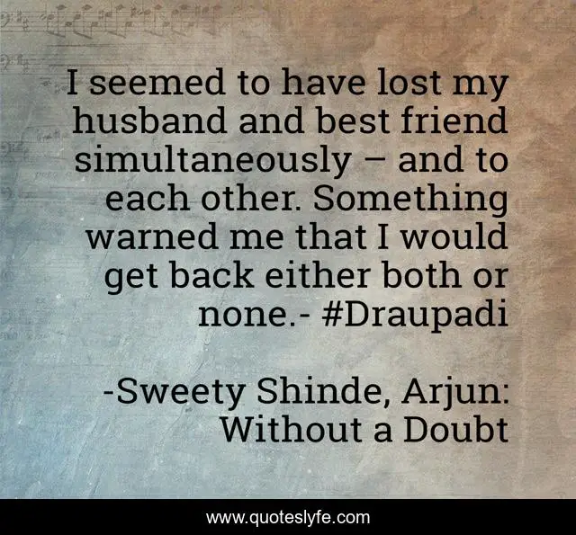 This page presents the quote "I seemed to have lost my husband and best friend simultaneously – and to each other. Something warned me that I would get back either both or none.- #Draupadi". Author of this quote is Sweety Shinde, Arjun: Without a Doubt. This quote is about emotional, friendship, romantic,.