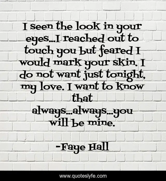 This page presents the quote "I seen the look in your eyes...I reached out to touch you but feared I would mark your skin. I do not want just tonight, my love. I want to know that always...always...you will be mine.". Author of this quote is Faye Hall. This quote is about eyes, love, look, touch, fear, always-and-forever, affection,.