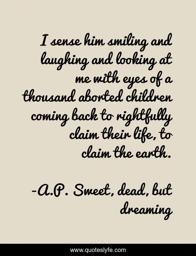 This page presents the quote "I sense him smiling and laughing and looking at me with eyes of a thousand aborted children coming back to rightfully claim their life, to claim the earth.". Author of this quote is A.P. Sweet, dead, but dreaming. This quote is about life, abortion, laughing, earth, smiling, children,.