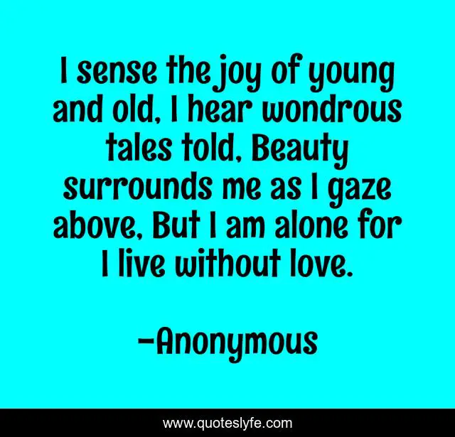 This page presents the quote "I sense the joy of young and old, I hear wondrous tales told, Beauty surrounds me as I gaze above, But I am alone for I live without love.". Author of this quote is Anonymous. This quote is about loneliness, love, affection, wonder,.
