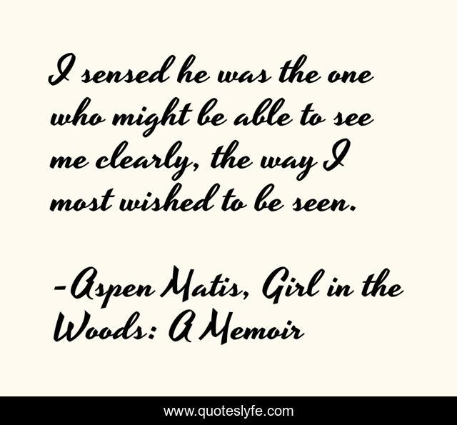 This page presents the quote "I sensed he was the one who might be able to see me clearly, the way I most wished to be seen.". Author of this quote is Aspen Matis, Girl in the Woods: A Memoir. This quote is about hiking-the-pct, aspen-matis, love, memoir, affection,.