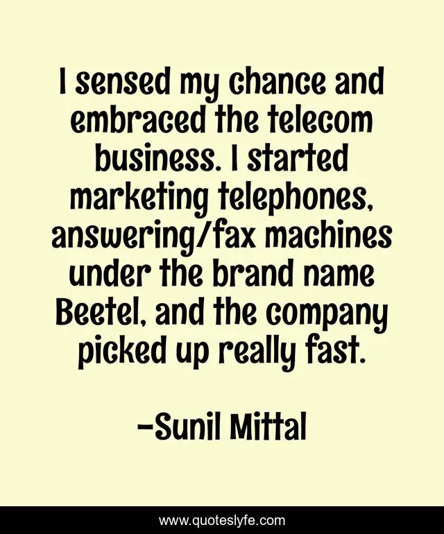 This page presents the quote "I sensed my chance and embraced the telecom business. I started marketing telephones, answering/fax machines under the brand name Beetel, and the company picked up really fast.". Author of this quote is Sunil Mittal. This quote is about marketing, company, business,.
