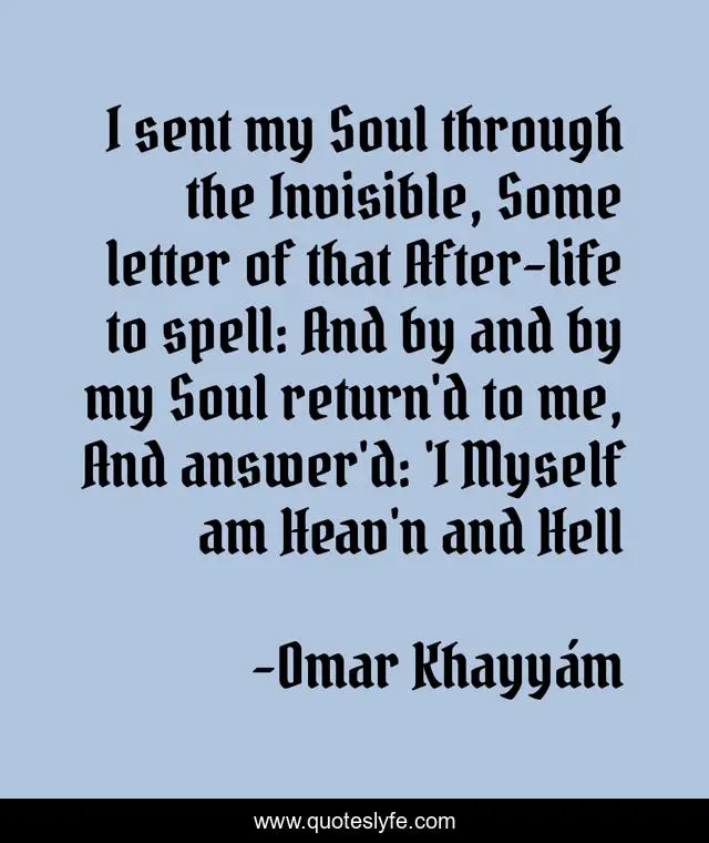 I sent my Soul through the Invisible, Some letter of that After-life to spell: And by and by my Soul return'd to me, And answer'd: 'I Myself am Heav'n and Hell