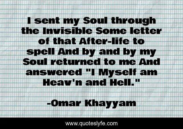 This page presents the quote "I sent my Soul through the Invisible Some letter of that After-life to spell And by and by my Soul returned to me And answered "I Myself am Heav'n and Hell."". Author of this quote is Omar Khayyam. .