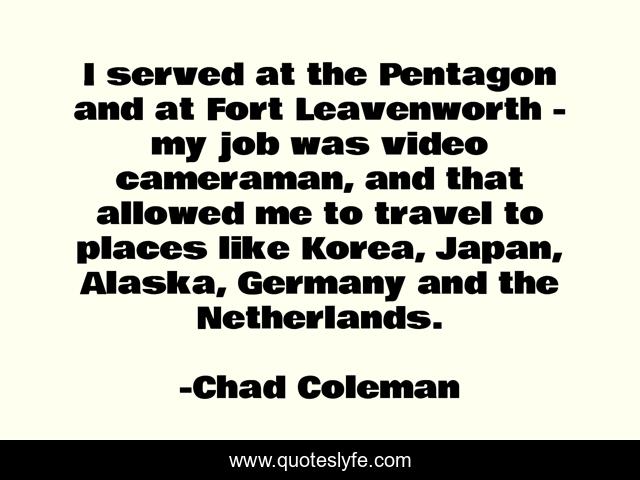 This page presents the quote "I served at the Pentagon and at Fort Leavenworth - my job was video cameraman, and that allowed me to travel to places like Korea, Japan, Alaska, Germany and the Netherlands.". Author of this quote is Chad Coleman. This quote is about me, japan, job,.