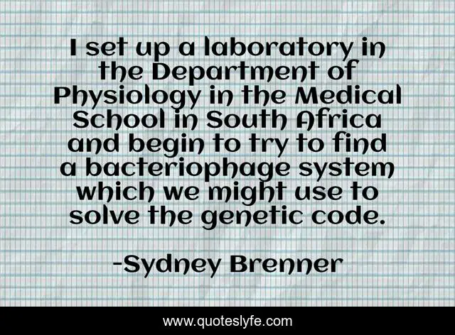 This page presents the quote "I set up a laboratory in the Department of Physiology in the Medical School in South Africa and begin to try to find a bacteriophage system which we might use to solve the genetic code.". Author of this quote is Sydney Brenner. This quote is about try, school, africa,.