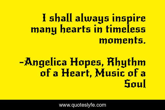 This page presents the quote "I shall always inspire many hearts in timeless moments.". Author of this quote is Angelica Hopes, Rhythm of a Heart, Music of a Soul. This quote is about sharing, wisdom, wit, inspirational, enthusiasm, unconditional,.