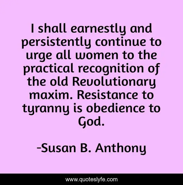 This page presents the quote "I shall earnestly and persistently continue to urge all women to the practical recognition of the old Revolutionary maxim. Resistance to tyranny is obedience to God.". Author of this quote is Susan B. Anthony. This quote is about tyranny, god, resistance,.