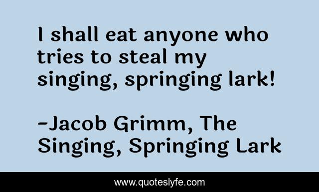This page presents the quote "I shall eat anyone who tries to steal my singing, springing lark!". Author of this quote is Jacob Grimm, The Singing, Springing Lark. This quote is about brothers-grimm, beauty, beast, lion, lark, lady,.