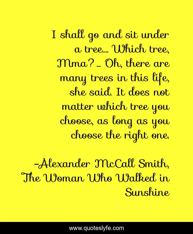This page presents the quote "I shall go and sit under a tree…. Which tree, Mma?... Oh, there are many trees in this life, she said. It does not matter which tree you choose, as long as you choose the right one.". Author of this quote is Alexander McCall Smith, The Woman Who Walked in Sunshine. This quote is about alexander-mccall-smith, trees, sitting,.