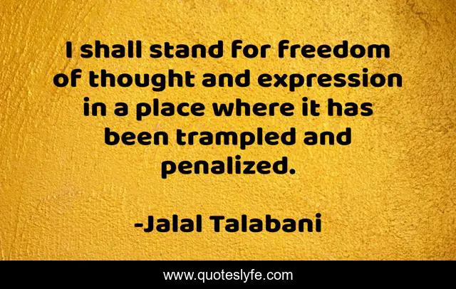 This page presents the quote "I shall stand for freedom of thought and expression in a place where it has been trampled and penalized.". Author of this quote is Jalal Talabani. This quote is about thought, place, stand,.