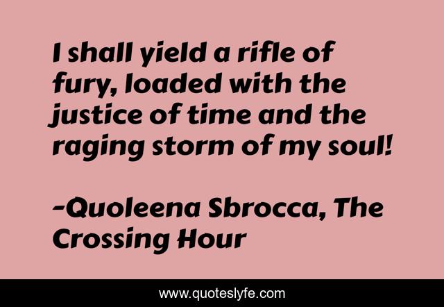 This page presents the quote "I shall yield a rifle of fury, loaded with the justice of time and the raging storm of my soul!". Author of this quote is Quoleena Sbrocca, The Crossing Hour. This quote is about justice, vengence,.