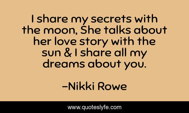 This page presents the quote "I share my secrets with the moon, She talks about her love story with the sun & I share all my dreams about you.". Author of this quote is Nikki Rowe. This quote is about love, twinflame-love, twin-flame, love-story, twin-soul, affection,.