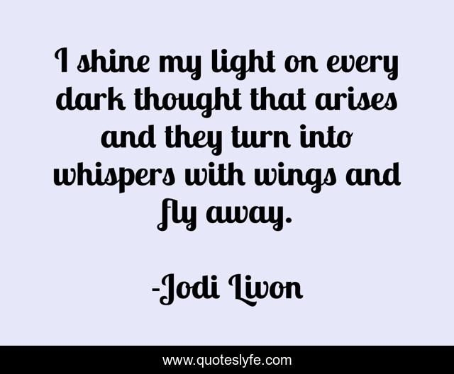 This page presents the quote "I shine my light on every dark thought that arises and they turn into whispers with wings and fly away.". Author of this quote is Jodi Livon. This quote is about medium, spiritual-wisdom, jodilivon, inner-guidance, peacefulness, spiritual-sayings, transformation, spirituality, thehappymedium,.