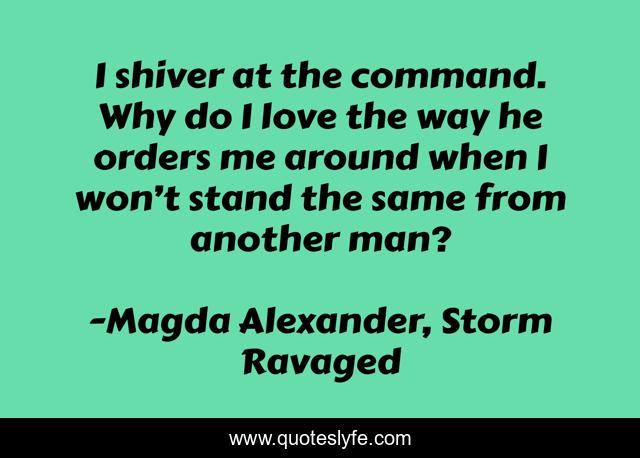 This page presents the quote "I shiver at the command. Why do I love the way he orders me around when I won’t stand the same from another man?". Author of this quote is Magda Alexander, Storm Ravaged. This quote is about romance, erotic-romance, romantic-suspense,.