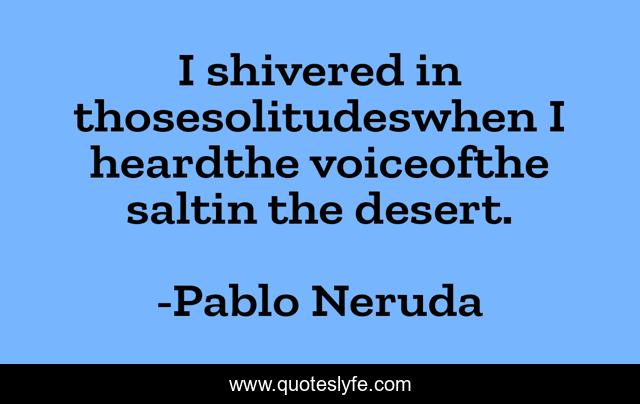 This page presents the quote "I shivered in thosesolitudeswhen I heardthe voiceofthe saltin the desert.". Author of this quote is Pablo Neruda. This quote is about solitude, salt, desert, poetry,.