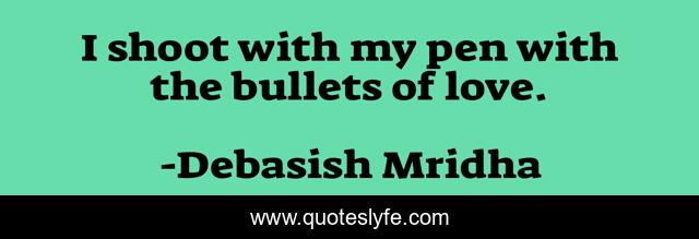 This page presents the quote "I shoot with my pen with the bullets of love.". Author of this quote is Debasish Mridha. This quote is about miraboli, oscar-wilde, philosophy, debasish-mridha, tagore, debasish-mridha-md, quotes, buddha, gandhi,.