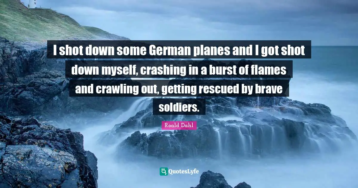 This page presents the quote "I shot down some German planes and I got shot down myself, crashing in a burst of flames and crawling out, getting rescued by brave soldiers.". Author of this quote is Roald Dahl. This quote is about planes, brave soldiers, soldier, crawling, flames, bravery,.