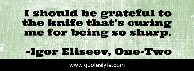 This page presents the quote "I should be grateful to the knife that’s curing me for being so sharp.". Author of this quote is Igor Eliseev, One-Two. This quote is about faith, life, two-souls, experience, dramatic-moment, drama, philosophical, inspirational, enthusiasm,.