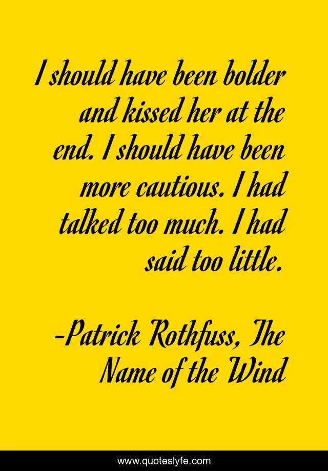This page presents the quote "I should have been bolder and kissed her at the end. I should have been more cautious. I had talked too much. I had said too little.". Author of this quote is Patrick Rothfuss, The Name of the Wind. This quote is about love, inexperience, caution, make-a-move, girl, fear, ponder, second-guess, question,.