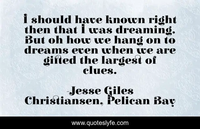 This page presents the quote "I should have known right then that I was dreaming. But oh how we hang on to dreams even when we are gifted the largest of clues.". Author of this quote is Jesse Giles Christiansen, Pelican Bay. This quote is about dreams, pelican-bay, dreaming,.