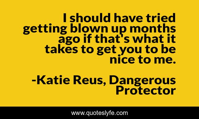 This page presents the quote "I should have tried getting blown up months ago if that's what it takes to get you to be nice to me.". Author of this quote is Katie Reus, Dangerous Protector. This quote is about romantic-thriller, romantic-suspense,.