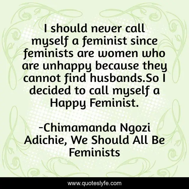 This page presents the quote "I should never call myself a feminist since feminists are women who are unhappy because they cannot find husbands.So I decided to call myself a Happy Feminist.". Author of this quote is Chimamanda Ngozi Adichie, We Should All Be Feminists. .