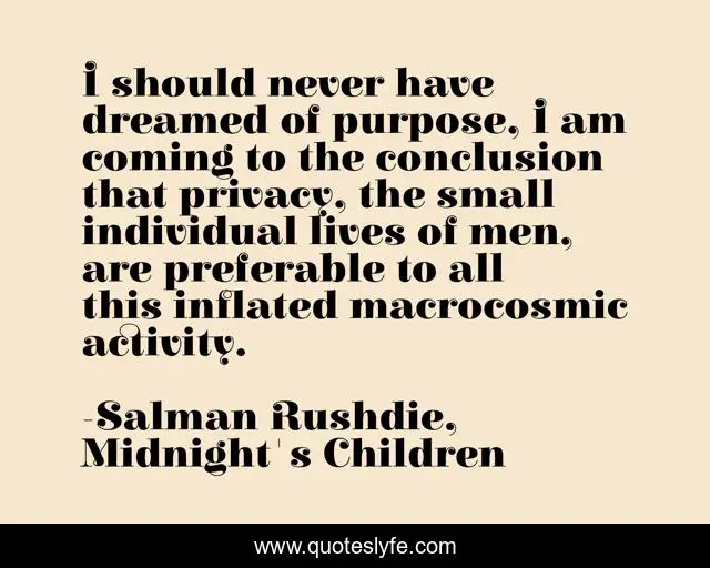 This page presents the quote "I should never have dreamed of purpose, I am coming to the conclusion that privacy, the small individual lives of men, are preferable to all this inflated macrocosmic activity.". Author of this quote is Salman Rushdie, Midnight's Children. This quote is about privacy, purpose, grandeur, fame,.